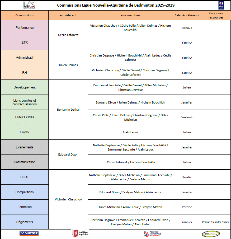 Organigramme de la Ligue Conseil d'administration Présidente : Cécile LAFORESTcecile.laforest@lnaqbad.fr Trésorier : Christian DEGRAVEchristian.degrave@lnaqbad.fr Trésorier adjoint : Hichem BOUCHIKHIhichem.bouchikhi@lnaqbad.fr Secrétaire général : Julien DELMASjulien.delmas@lnaqbad.fr Vice-Président structuration : Benjamin DELHALbenjamin.delhal@lnaqbad.fr Vice Présidente pratiques sportives : Cécile PELLEcecile.pelle@lnaqbad.fr Cécile DAURELcecile.daurel@lnaqbad.fr Françoise ARAMENDYfrançoise.aramendy@lnaqbad.fr Evelyne MATONevelyne.maton@lnaqbad.fr Nathalie DEPLANCKEnathalie.deplancke@lnaqbad.fr Alain LEDUCalain.leduc@lnaqbad.fr Victorien CHAUCHOYvictorien.chauchoy@lnaqbad.fr Emmanuel LECOINTEemmanuel.lecointe@lnaqbad.fr Gilles MICHELANgilles.michelan@lnaqbad.fr Edouard DIXONedouard.dixon@lnaqbad.fr Salarié(e)s Directeur Yannick MEUNIER 06 08 62 58 03 yannick.meunier@lnaqbad.fr Responsable Emploi et Formation - Aude PINET 07 45 02 31 29 aude.pinet@lnaqbad.fr Responsable du Pôle Espoir et de la culture de la performance Renaud ARNOU06 60 47 69 95renaud.arnou@lnaqbad.fr Entraîneur - Formateur Anthony CAJOT 07 63 57 54 44 anthony.cajot@lnaqbad.fr Animatrice Technique Territoriale Jennifer HURTEAU 06 50 90 69 47 jennifer.hurteau@lnaqbad.fr Agent de Développement - Formateur zone EST Julien SAUTOUR 06 22 90 40 83 julien.sautour@lnaqbad.fr Secrétaire comptable Saadia ALLOUCHE05 56 51 55 43 / 07 83 01 94 61contact@lnaqbad.fr Chargée de communication, évènementiel et marketing Alexia BRIFFEAU 07 49 84 69 93 alexia.briffeau@lnaqbad.fr Agent de structuration Benjamin MOGUEROU07 49 37 44 40benjamin.moguerou@lnaqbad.fr Chargée de mission formation et optimisation des fonctionnements Perrine ROUSSEL 07 45 02 31 29 perrine.roussel@lnaqbad.fr Agent de développement - public jeune et féminin Léane LEMOINEleane.lemoine@lnaqbad.fr Agent de développement - publics sénior et dirigeant Cameron DUPHIL cameron.duphil@lnaqbad.fr