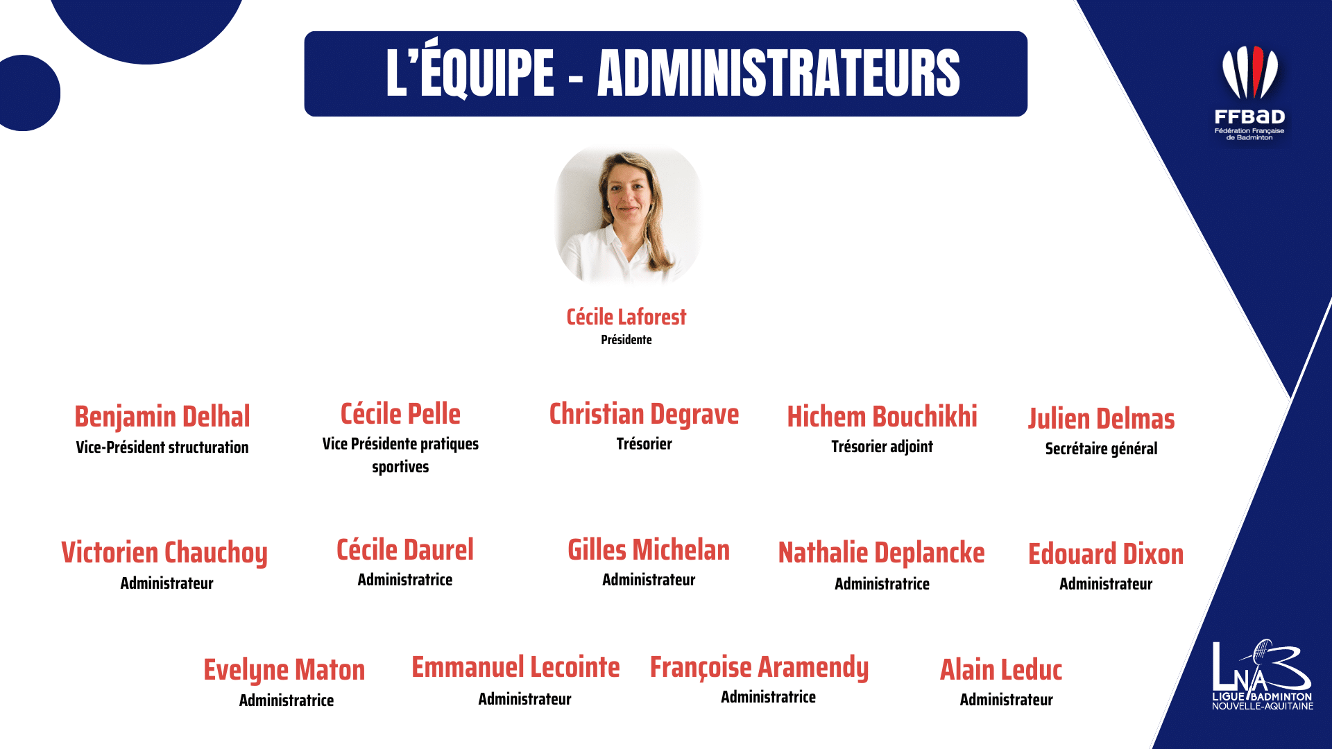 Organigramme de la Ligue Conseil d'administration Présidente : Cécile LAFORESTcecile.laforest@lnaqbad.fr Trésorier : Christian DEGRAVEchristian.degrave@lnaqbad.fr Trésorier adjoint : Hichem BOUCHIKHIhichem.bouchikhi@lnaqbad.fr Secrétaire général : Julien DELMASjulien.delmas@lnaqbad.fr Vice-Président structuration : Benjamin DELHALbenjamin.delhal@lnaqbad.fr Vice Présidente pratiques sportives : Cécile PELLEcecile.pelle@lnaqbad.fr Cécile DAURELcecile.daurel@lnaqbad.fr Françoise ARAMENDYfrançoise.aramendy@lnaqbad.fr Evelyne MATONevelyne.maton@lnaqbad.fr Nathalie DEPLANCKEnathalie.oddos@lnaqbad.fr Alain LEDUCalain.leduc@lnaqbad.fr Victorien CHAUCHOYvictorien.chauchoy@lnaqbad.fr Emmanuel LECOINTEemmanuel.lecointe@lnaqbad.fr Gilles MICHELANgilles.michelan@lnaqbad.fr Edouard DIXONedouard.dixon@lnaqbad.fr Salarié(e)s Directeur Yannick MEUNIER 06 08 62 58 03 yannick.meunier@lnaqbad.fr Responsable Emploi et Formation - Aude PINET 07 45 02 31 29 aude.pinet@lnaqbad.fr Responsable du Pôle Espoir et de la culture de la performance Renaud ARNOU06 60 47 69 95renaud.arnou@lnaqbad.fr Entraîneur - Formateur Anthony CAJOT 07 63 57 54 44 anthony.cajot@lnaqbad.fr Animatrice Technique Territoriale Jennifer HURTEAU 06 50 90 69 47 jennifer.hurteau@lnaqbad.fr Agent de Développement - Formateur zone EST Julien SAUTOUR 06 22 90 40 83 julien.sautour@lnaqbad.fr Secrétaire comptable Saadia ALLOUCHE05 56 51 55 43 / 07 83 01 94 61contact@lnaqbad.fr Chargée de communication, évènementiel et marketing Alexia BRIFFEAU 07 49 84 69 93 alexia.briffeau@lnaqbad.fr Agent de structuration Benjamin MOGUEROU07 49 37 44 40benjamin.moguerou@lnaqbad.fr Chargée de mission formation et optimisation des fonctionnements Perrine ROUSSEL 07 45 02 31 29 perrine.roussel@lnaqbad.fr Agent de développement - public jeune et féminin Léane LEMOINEleane.lemoine@lnaqbad.fr Agent de développement - publics sénior et dirigeant Cameron DUPHIL cameron.duphil@lnaqbad.fr